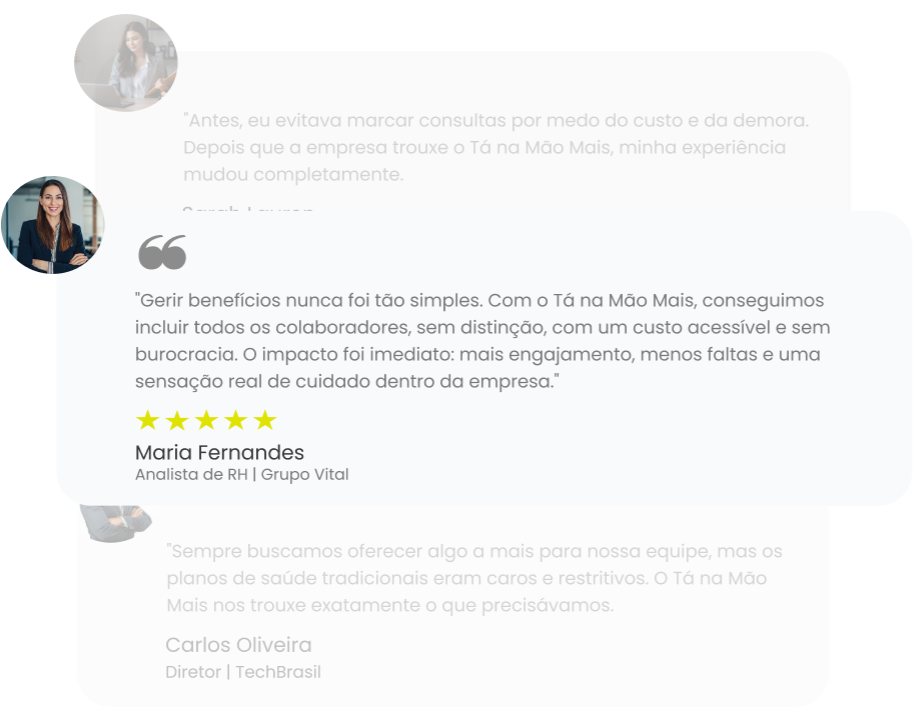 Ofereça um benefício acessível e completo para seus colaboradores. Com o Tá na Mão Mais, sua empresa cuida da saúde da equipe e ainda melhora a produtividade, reduz absenteísmo e valoriza quem faz seu negócio acontecer.